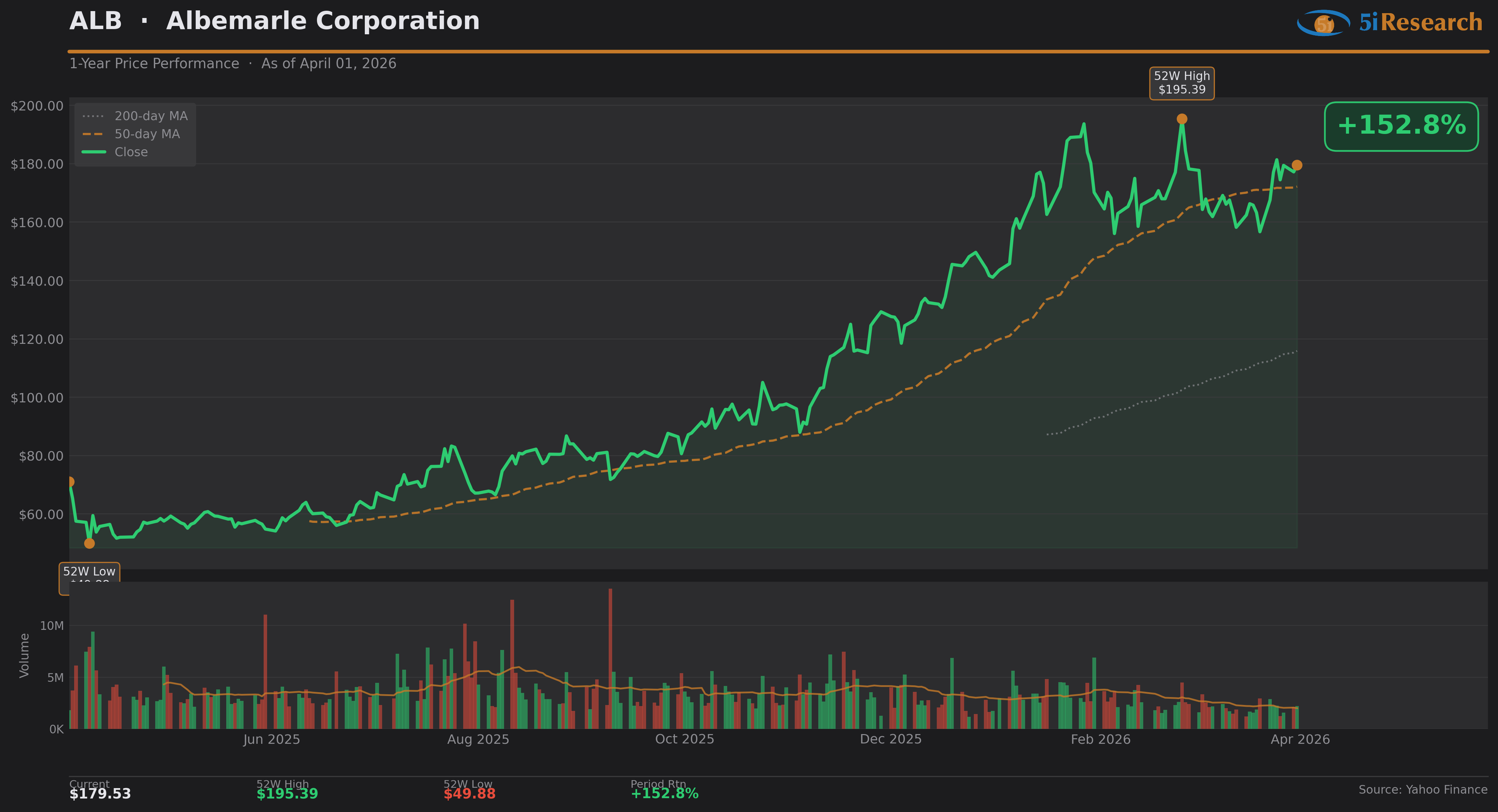 Albemarle is the world's largest lithium producer, supplying battery-grade material to electric vehicle manufacturers and energy storage customers across North America, Europe, and Asia. The company has undergone a significant strategic repositioning — divesting a majority stake in its Ketjen refining catalyst business to sharpen its focus on lithium and energy transition materials, while using the proceeds to reduce debt and improve balance sheet quality. Long-term supply agreements with major automakers and the structural demand outlook for battery-grade lithium have driven a sharp re-rating by institutional investors, with Wall Street sentiment shifting decisively more constructive as the company's cleaner business profile comes into focus.