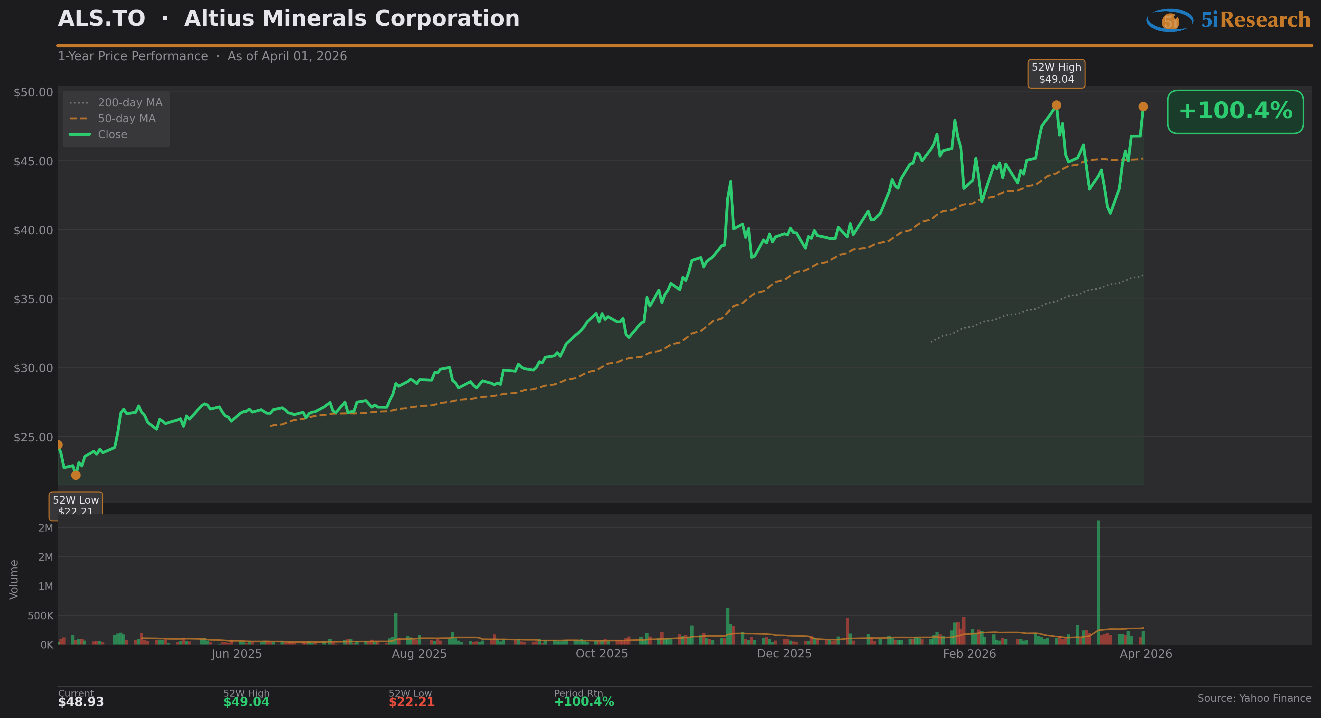 Altius is a diversified royalty company with interests spanning potash, copper, iron ore, and renewable energy — a structure that can generate revenue as underlying commodity prices rise without taking on direct operating risk. The company completed its acquisition of Lithium Royalty Corp in February, meaningfully expanding its battery metals exposure just as critical mineral demand is accelerating, and recently reported full-year attributable royalty revenue growth driven by stronger potash and base metal pricing. Multiple analysts raised price targets following the results, reflecting growing recognition that the royalty model's leverage to commodity strength is being underappreciated relative to peers.