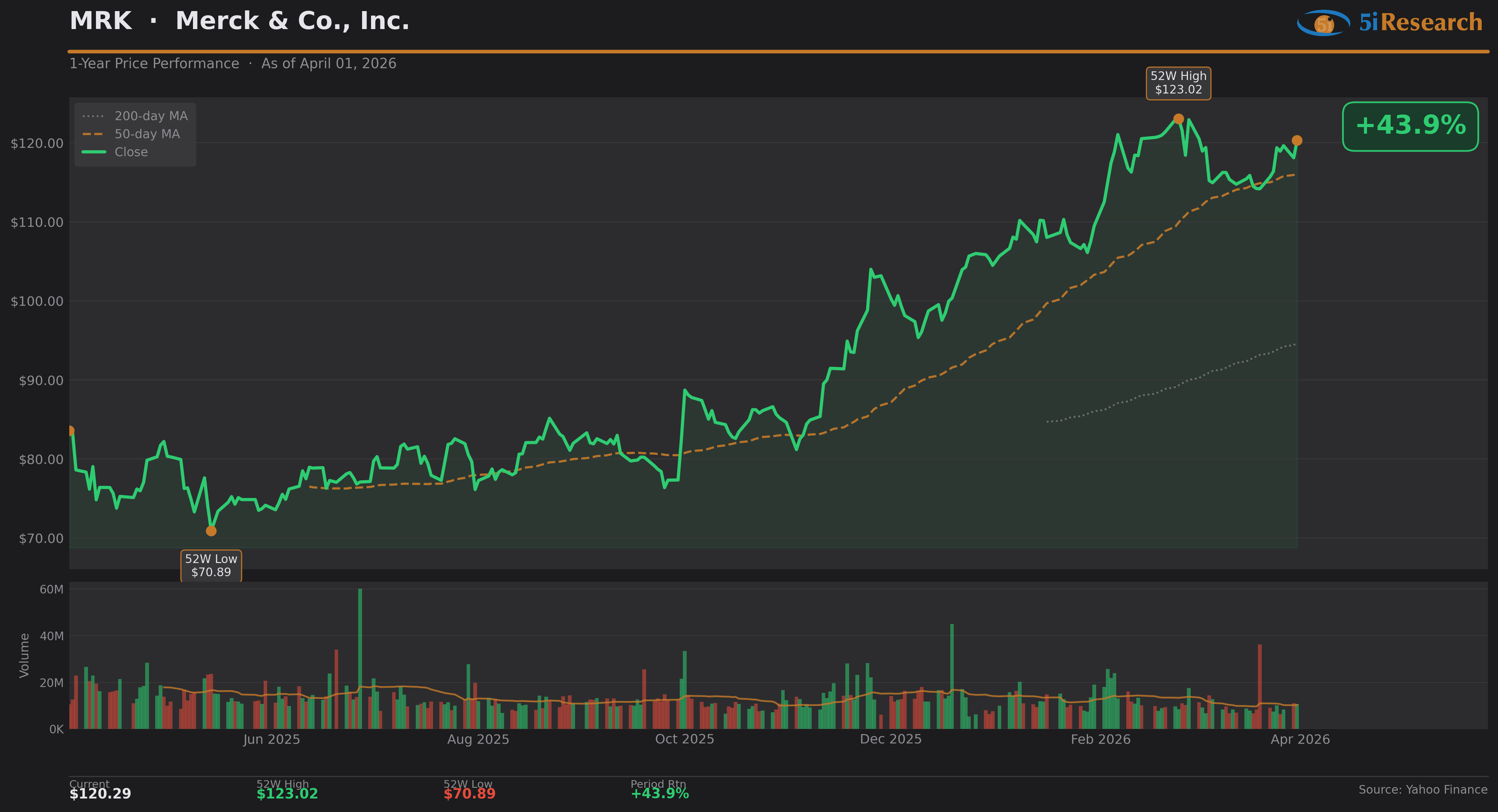 Merck is a global pharmaceutical leader best known for Keytruda, its flagship immuno-oncology franchise, which remains one of the highest-revenue drugs in the world across a broad range of cancer indications. The company just announced a $6.7 billion acquisition of Terns Pharmaceuticals to bolster its oncology pipeline ahead of the well-flagged Keytruda patent expiration — a clear signal that management is actively deploying capital to extend its growth runway rather than waiting for the cliff to arrive. In a market where investors are rotating into defensive names with durable cash flows, Merck's combination of recurring earnings, consistent dividend growth, and strategic M&A activity is keeping it in relative outperformance territory.