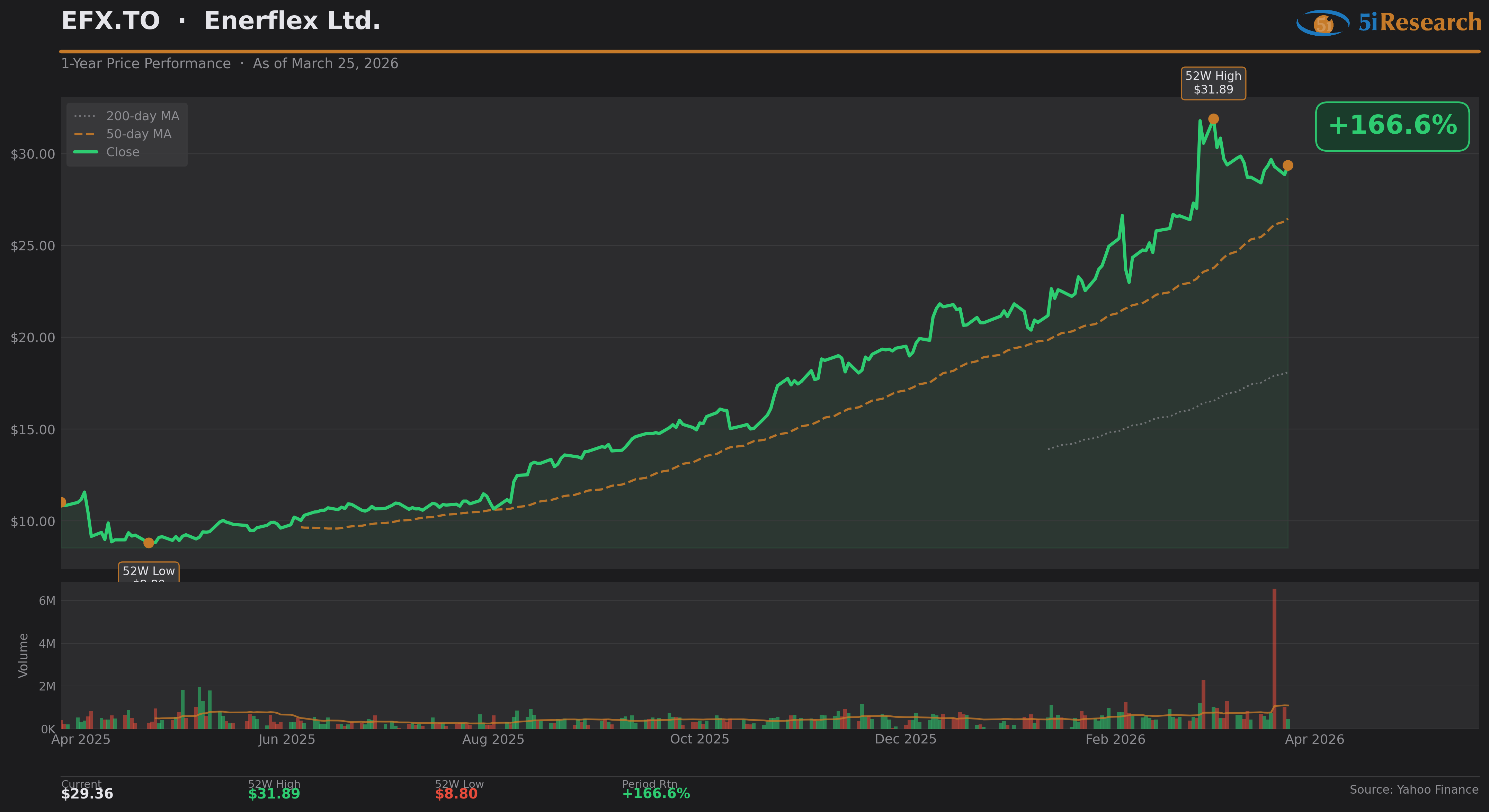 EFX designs, builds, and operates modular natural gas compression, processing, and power generation infrastructure across North America, Latin America, and the Eastern Hemisphere. The company is appearing on this week's list following a strong operational quarter marked by record free cash flow generation, meaningful debt reduction, and a strategic divestiture of a non-core business that sharpens its focus on higher-margin recurring revenue streams. With global demand for natural gas infrastructure accelerating and investors rotating toward energy services names with improving balance sheet discipline, Enerflex is finding renewed investor interest.