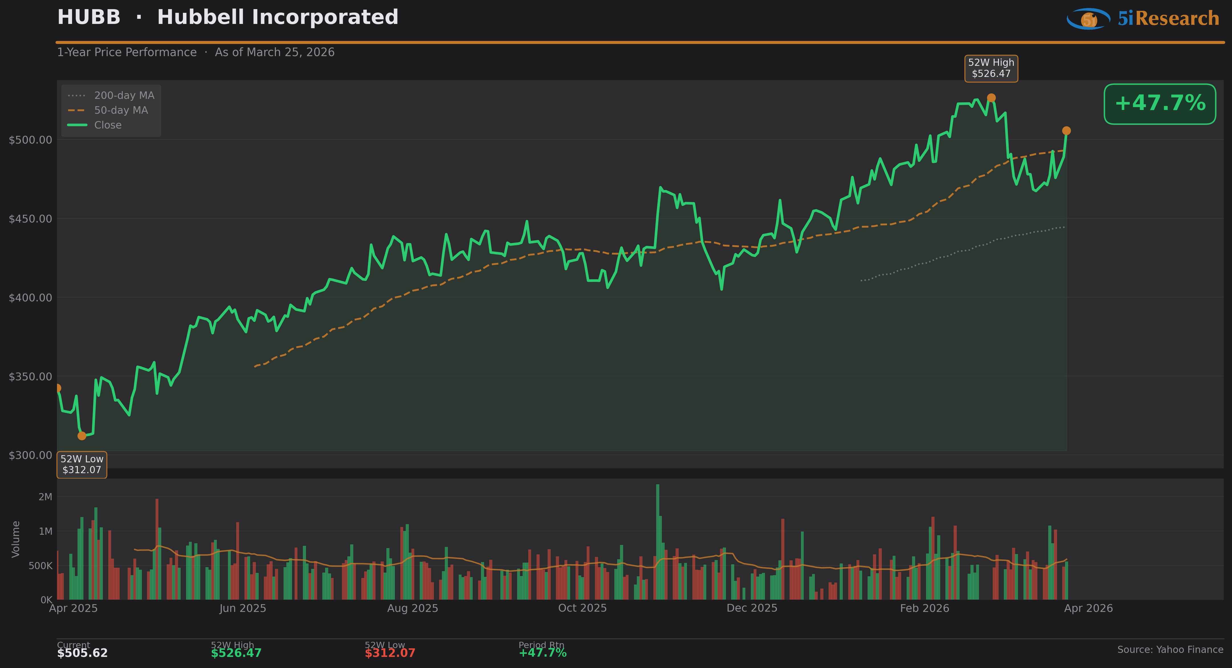 HUBB manufactures electrical products and grid infrastructure solutions serving utilities, industrial facilities, and data center operators across North America. The company is new to this week's list following a strong quarterly beat driven by organic demand for grid modernization and electrification products, with management guiding for continued mid-single-digit organic growth and raising its dividend — reinforcing confidence in the durability of its end markets. As investors search for industrial names with structural tailwinds insulated from trade uncertainty, Hubbell's exposure to long-cycle utility and data center spending is driving a sustained re-rating above the broader index.