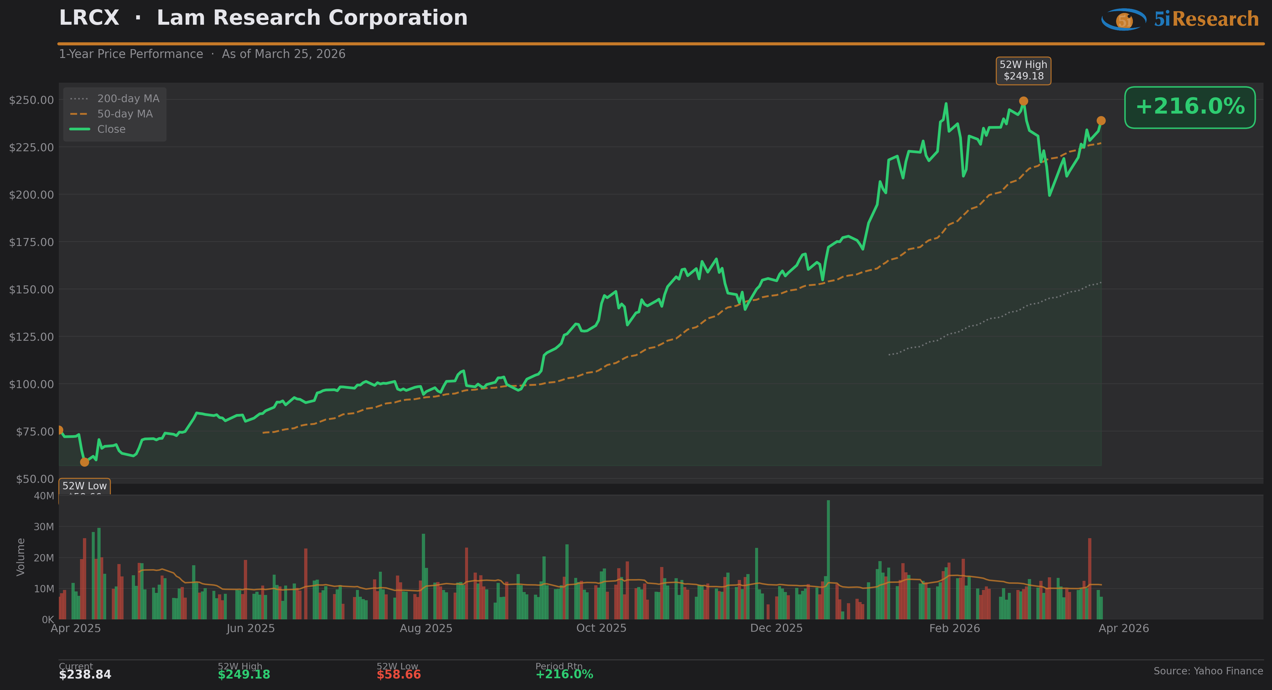LRCX designs and manufactures the specialized etch and deposition equipment that chipmakers depend on to build advanced memory and logic devices at scale. The company is on this week's list as the global wafer fabrication equipment spending cycle continues to broaden, with AI-driven demand for high-bandwidth memory and next-generation chip packaging translating into strengthening order visibility and upward earnings revisions across the semiconductor equipment sector. With institutional confidence building and multiple analysts lifting their outlooks, LRCX is benefiting from a clear convergence of fundamental momentum and sector rotation into hardware infrastructure.