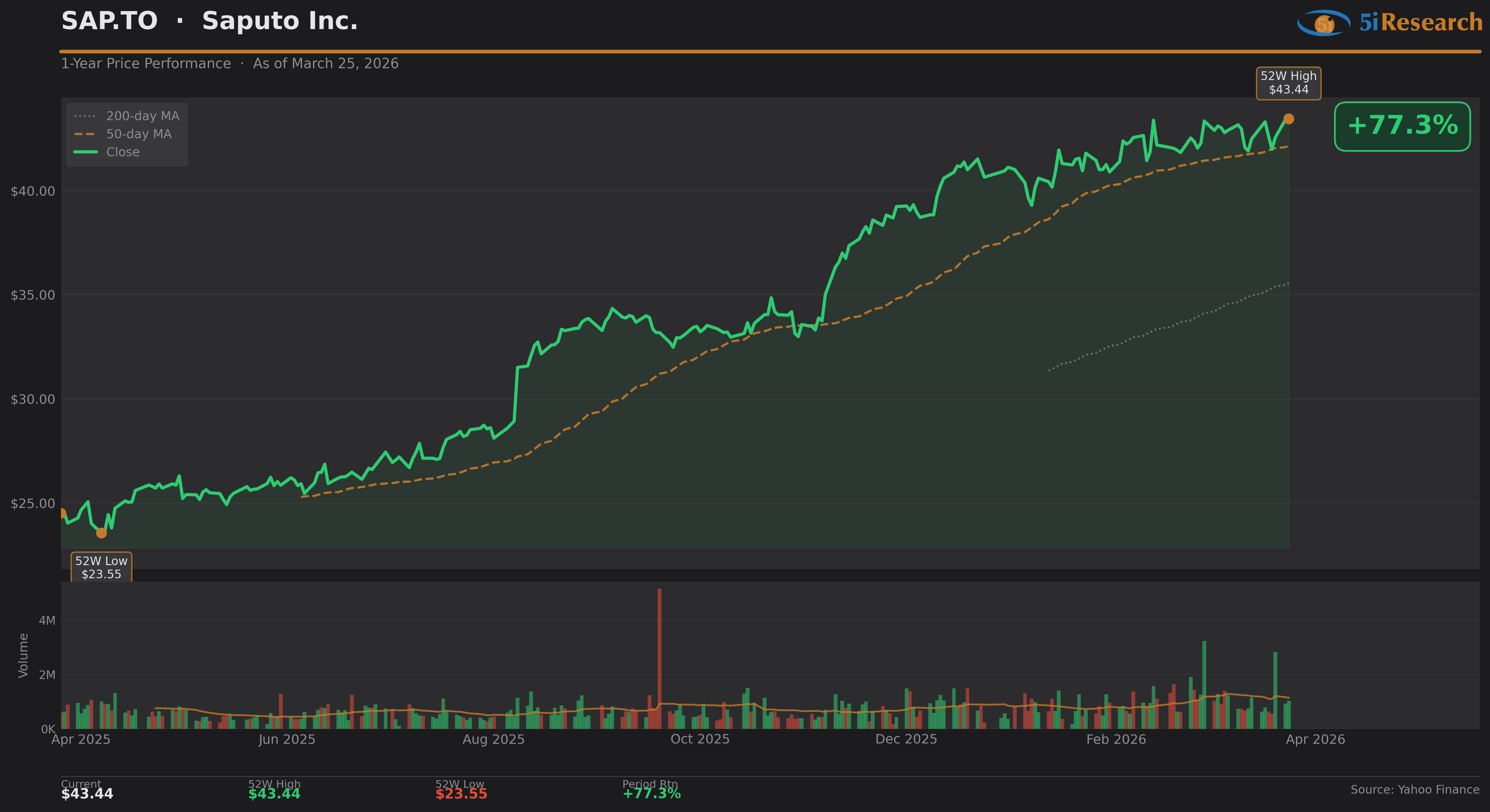 SAP is one of the world's largest dairy processors, operating across Canada, the United States, Australia, and international markets with a broad portfolio of cheese, fluid milk, and dairy ingredient products. The company is earning its place on this week's list on the back of a recovering earnings profile, with recent quarterly results coming in ahead of expectations as cost discipline and improving commodity conditions begin to flow through margins. Investors are rotating toward consumer staples names with steady cash flow and credible recovery momentum, and Saputo's improving execution is making that case more convincingly.