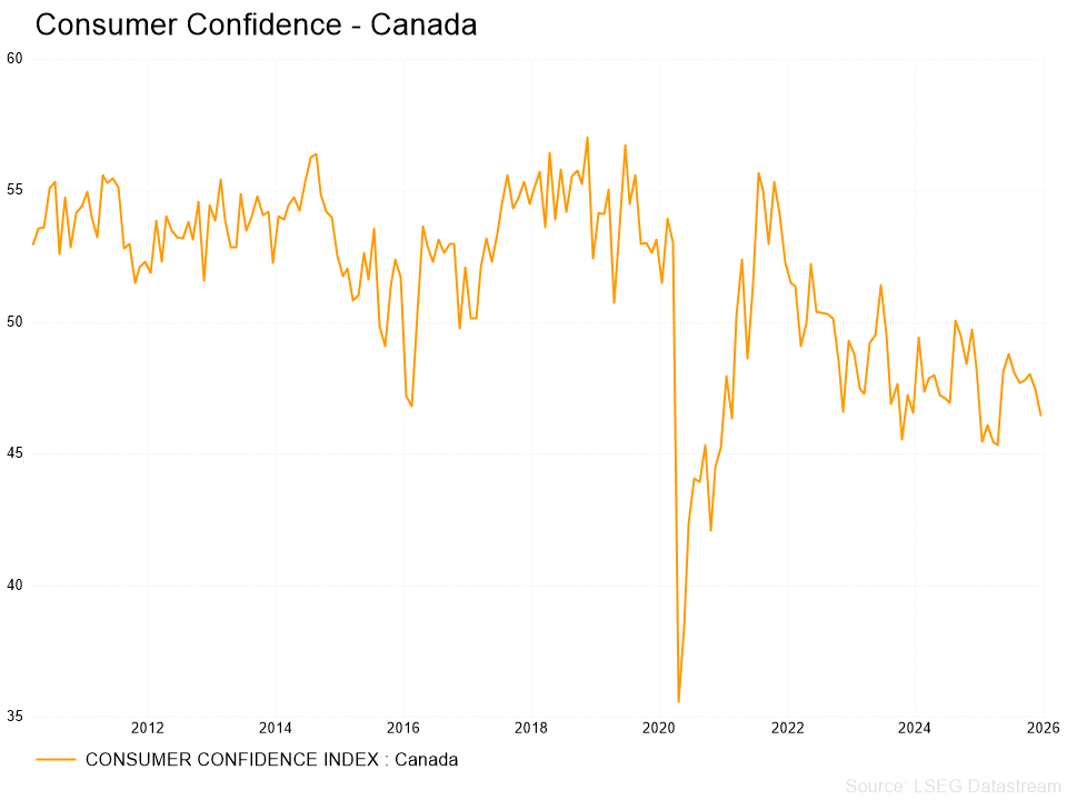 Canadian consumer confidence measures the personal financial situation and forward six-month financial situation of Canadian consumers as it relates to household or other purchases, job security, ability to invest, and others. The consumer confidence index has recently been quite weak and the Bank of Canada has introduced policy to gain back consumer confidence. It is not yet clear if this is the bottom of the consumer confidence index. A return in consumer confidence would signal positive developments for the economy and financial markets.
