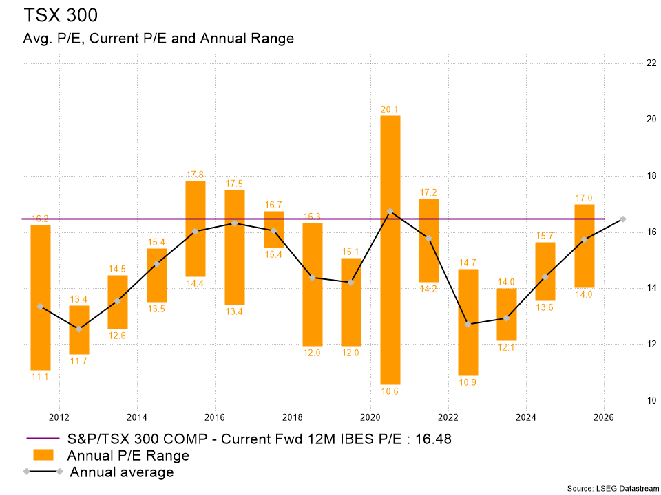 This chart is known as a ‘floating bar chart’. Each bar represents the high and low range that the TSX P/E fluctuated between for each respective year. The black line outlines the annual average P/E for each year.