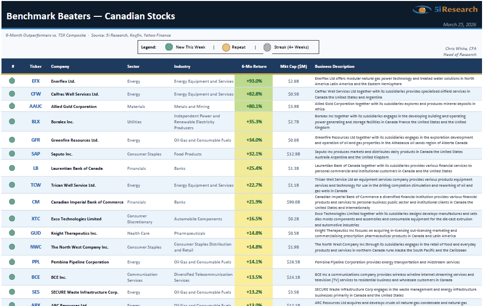 The full downloadable report - which includes dozens of Canadian and US names across new, repeat, and streak categories with sector, market cap, and 6-month performance data - is available here: Benchmark Beaters Sign-Up Form