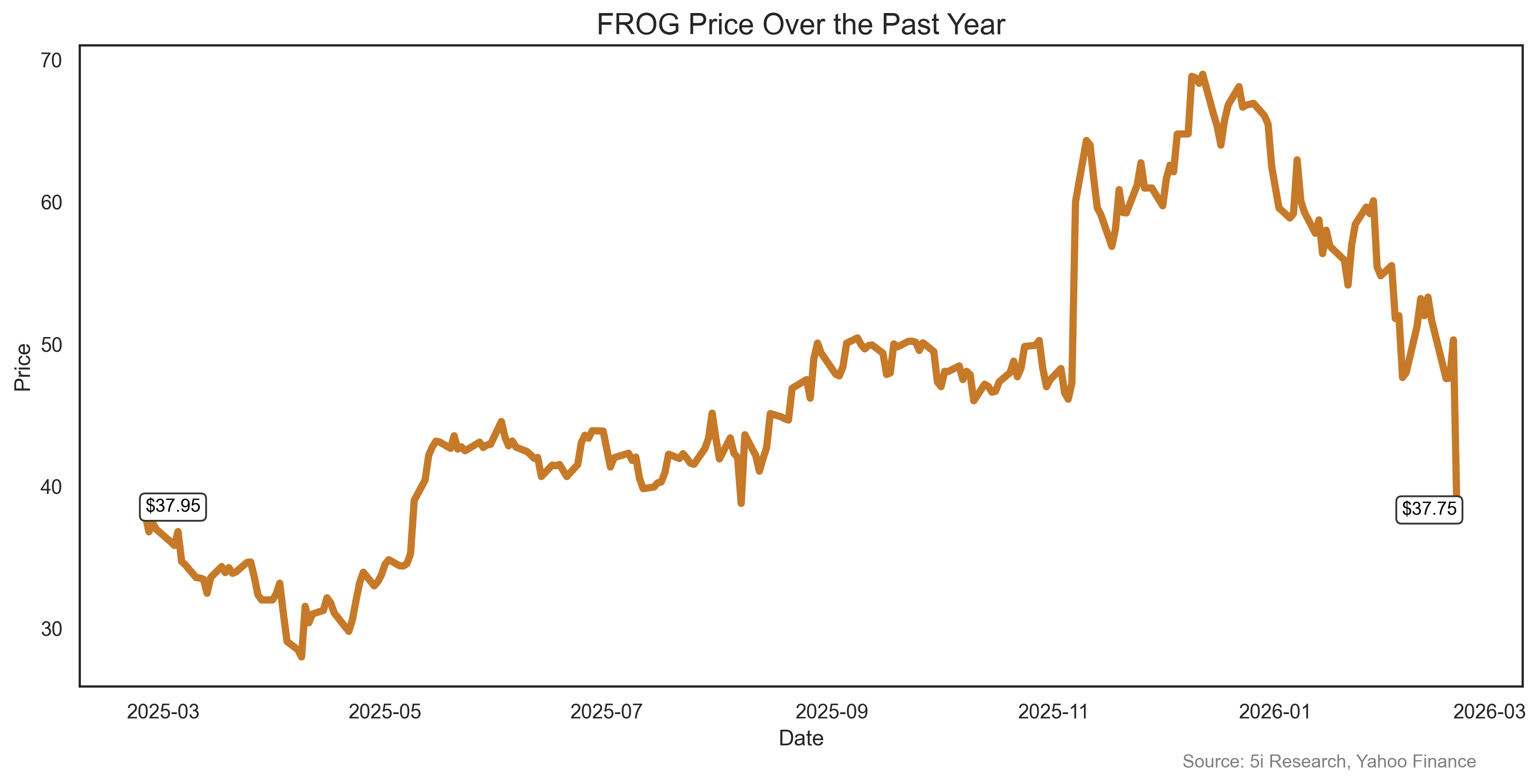 FROG shares fell 27% last week. Just another victim in the 2026 software destruction caused by AI. Cybersecurity companies such as JFrog were supposed to see increased business from AI, but when Antrhopic released 'Claude Code Security' last week the whole sector plunged. The AI-agent scans software codebases for security vulnerabilities that traditional methods often miss. Translated: Companies might not need as much cyber protection from third-party companies anymore. We can't predict how this will all turn out, but we still have some suggestions to help JFrog: MAYBE DON'T NAME YOUR COMPANY "FROG".