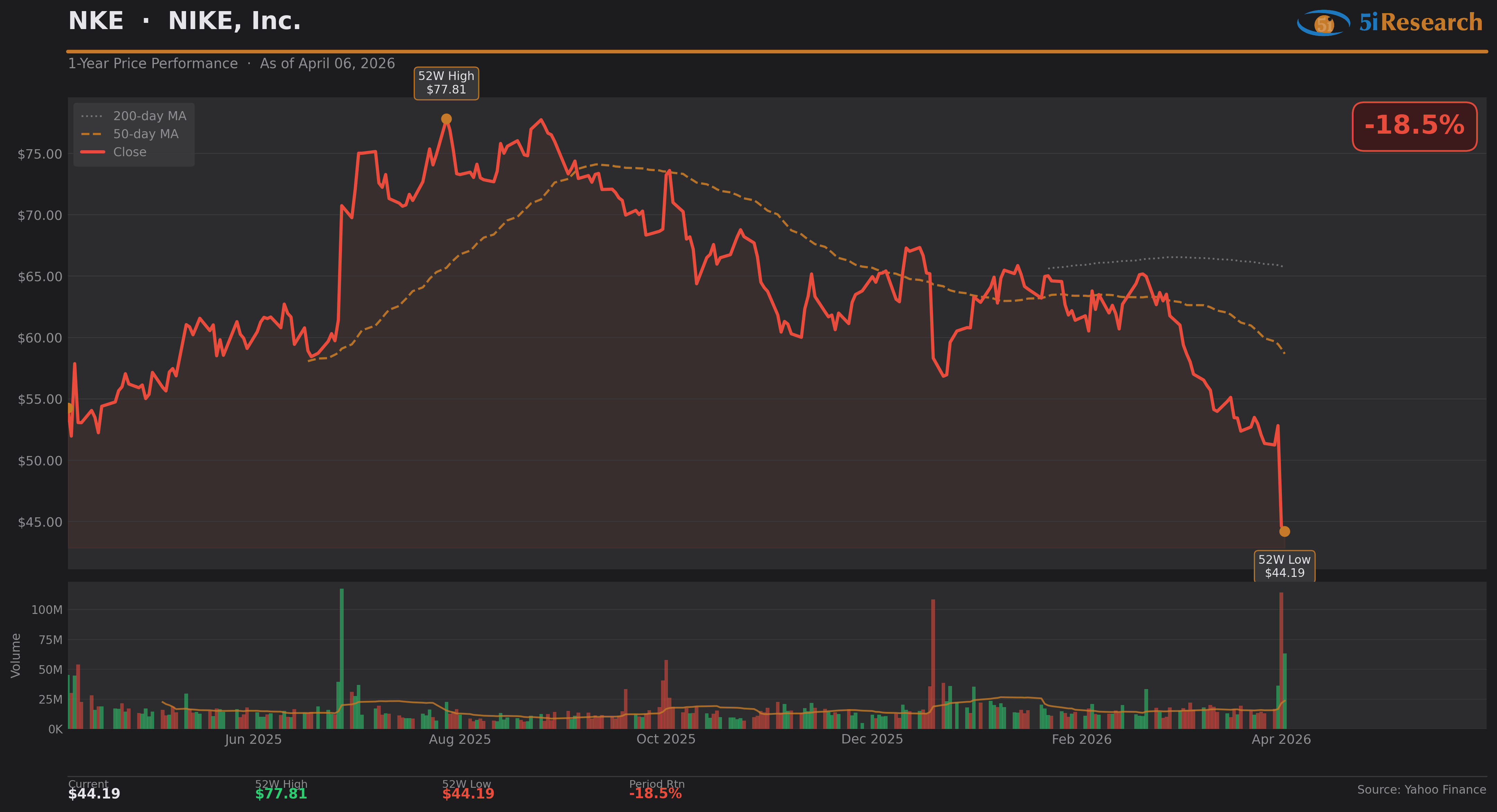 Nike published its fiscal Q3 results last week, and the stock closed down 15.5% the next day despite earnings of $0.35 per share coming in well ahead of analyst estimates of $0.28. Wall Street didn't care about the beat - it cared about the outlook. The company's Nike Direct segment declined 7% and Nike Digital fell 9%, and EPS fell roughly 54% compared to the prior-year period with gross margins compressing sharply. Nike stock hit its lowest level since 2014, and the CEO was reportedly venting about the company's struggles to "regain footing." The stock is now down 27% since the beginning of the year. Just DO IT - or at least do something.